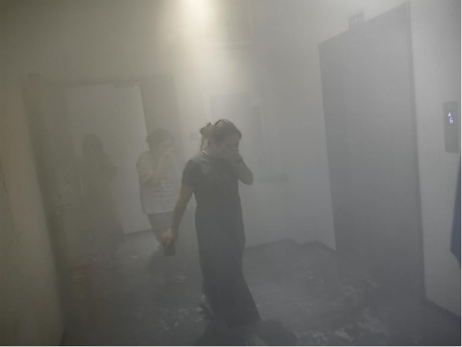 下午16時(shí),演習(xí)正式開(kāi)始。演習(xí)模擬辦公場(chǎng)所因電線老化引發(fā)火災(zāi),現(xiàn)場(chǎng)濃煙彌漫。消防警報(bào)拉響后,綜合部立即啟動(dòng)預(yù)案組織員工快速疏散。